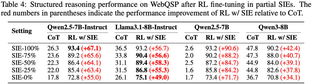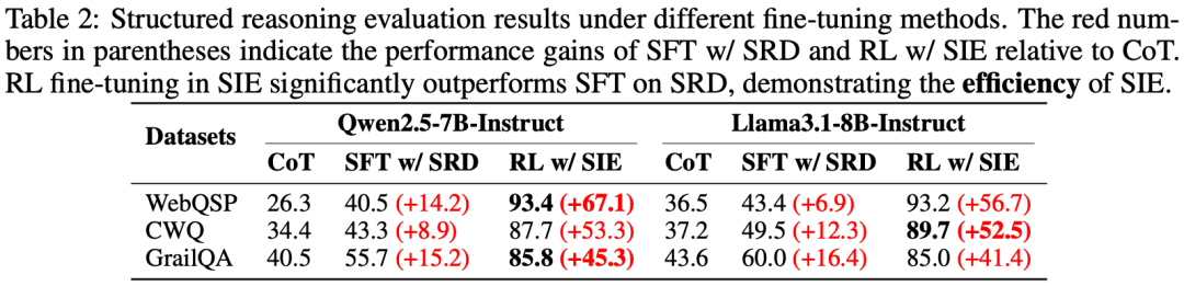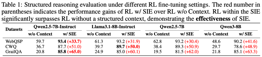 实验首先验证了 SIE 框架在领域内结构化推理任务上的表现。在 WebQSP、CWQ 和 GrailQA 等数据集上,相较于没有结构化上下文的 RL 基线,SIE 框架带来了巨大的性能飞跃。例如,在 WebQSP 任务上,引入 SIE 后模型性能平均提升了 30% 以上。这一结果表明,通过在结构化环境中进行探索式学习,模型处理复杂关联信息和多跳组合推理的能力得到了有效的提升。