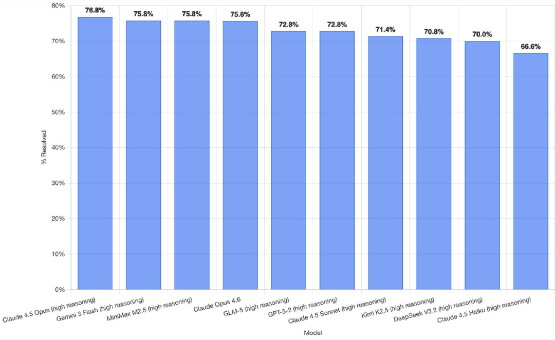 知名技术博主 Simon Willison 使用 mini-swe-agent 对当前主流模型进行了独立测评,结果显示 M2.5 排名第三,仅次于 Claude Opus 4.5 和 Gemini 3 Flash,且是开源模型中的第一名。