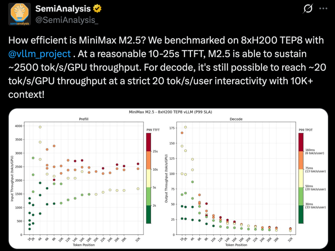 执行效率也有实质性提升。研究机构 SemiAnalysis 实测显示,在 8 张 H200 显卡上,M2.5 在合理首 token 延迟范围内能够持续达到每 GPU 每秒约 2500 个 token 的吞吐量,即便在严格要求每用户每秒 20 个 token 交互性的条件下,处理超过 1 万个 token 的上下文时仍能维持稳定的解码速度。