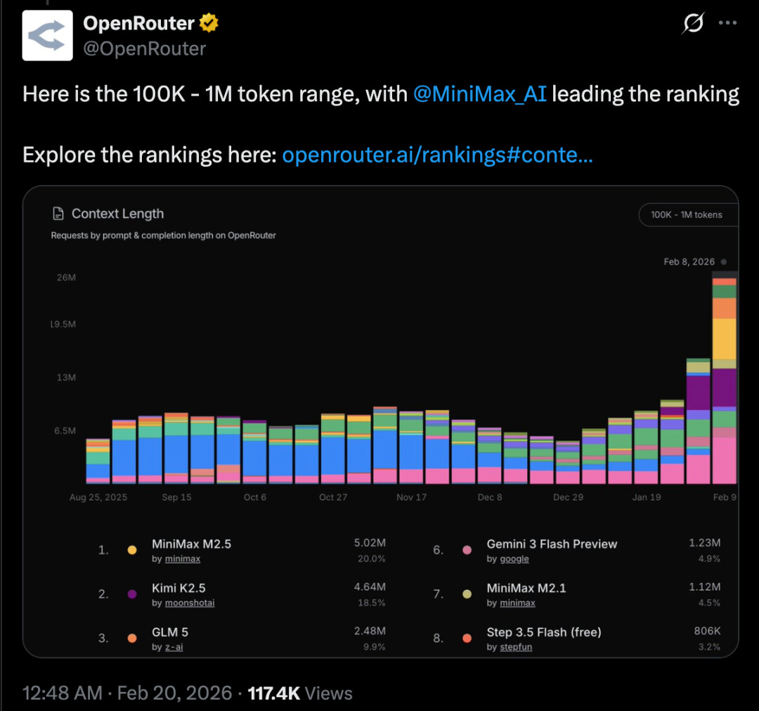 这还不是故事的全部。OpenRouter 整体调用量也在同步攀升。官方随后确认,M2.5 带动了 100K 至 1M 长文本区间的增量调用需求,而这个区间正是 Agent 工作流的典型消耗场景。