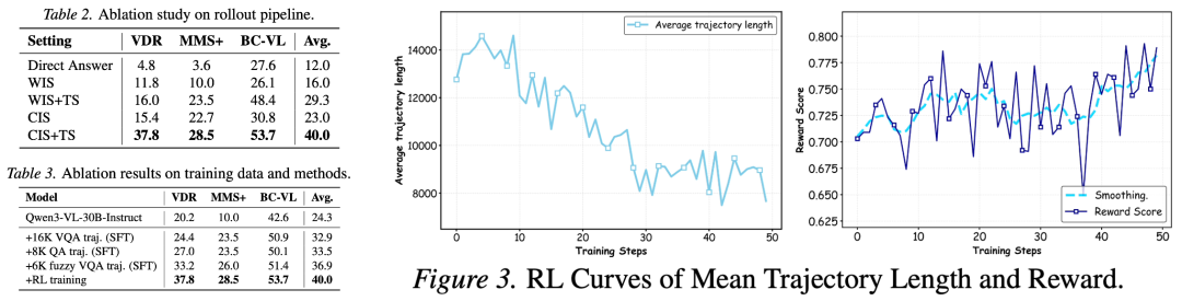 基于此,作者构建了一个面向真实世界搜索环境的多模态 deep-research 大模型,通过 VQA 数据合成 + 轨迹合成 + 冷启动 + 大规模强化学习,解决当前工作所忽略的引擎命中率问题,将推理轮数提高到数十轮,与搜索引擎交互次数提高到了数百次。