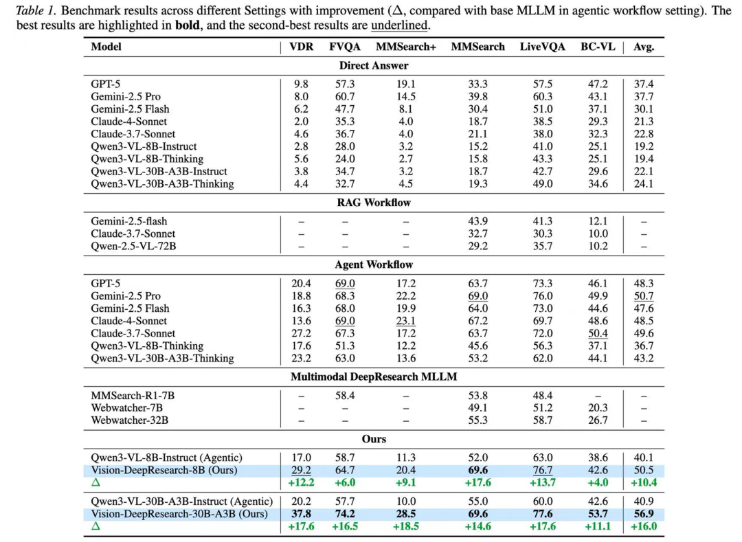 Vision-DeepResearch-30B-A3B 进一步把整体成绩推到更高水平(平均提升约 + 16.0%),在多个基准上持续扩大优势。超越 GPT-5、Gemini-2.5-Pro、Claude-4-Sonnet 等强大闭源模型构成的 deep-research 系统的性能。