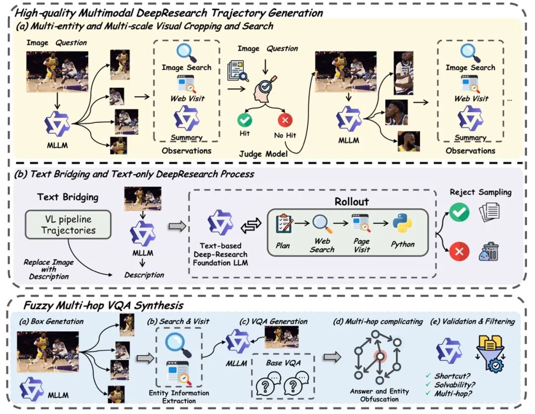 桥接文本 DeepResearch 能力:利用强文本 DeepResearch 基础模型生成对应的文本搜索长轨迹,实现跨模态长视野推理迁移。