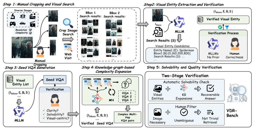 VDR-Bench 采用严格的「视觉优先」多阶段流程:
