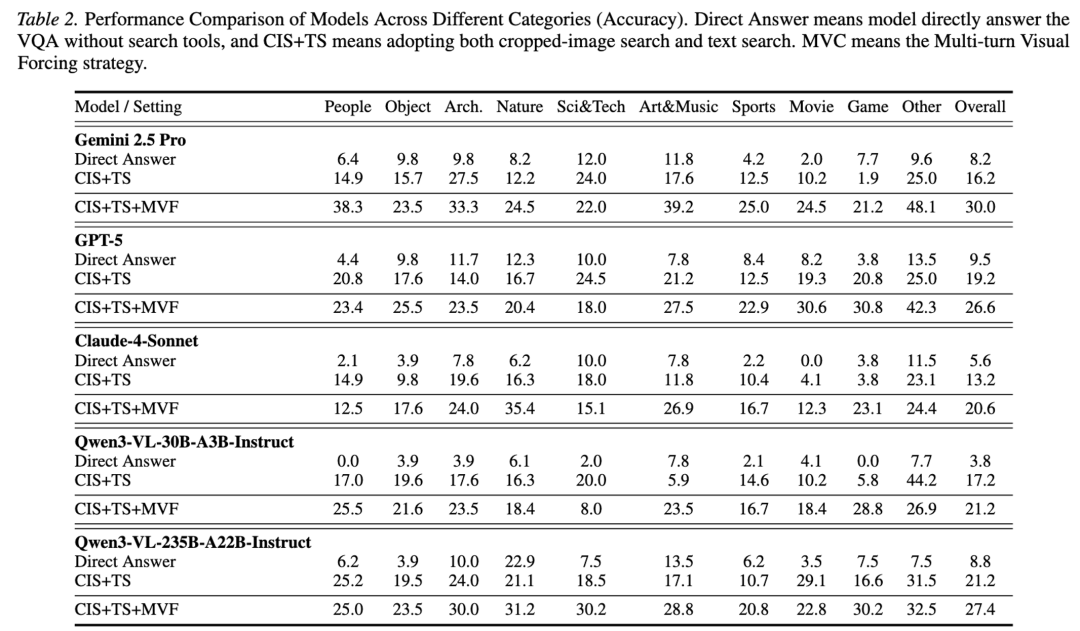 为缓解这一点,作者提出 Multi-turn Visual Forcing(MVF):在推理流程上强制多轮、多尺度裁剪与验证,大幅提升深度检索性能。