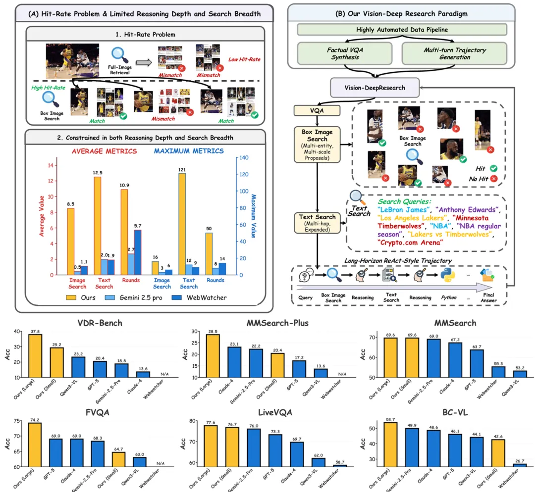 港中文等机构提出Vision-DeepResearch,一种多模态深度研究范式,小参数模型在多项基准测试中达到SOTA,并构建了更真实的评测基准VDR-Bench。