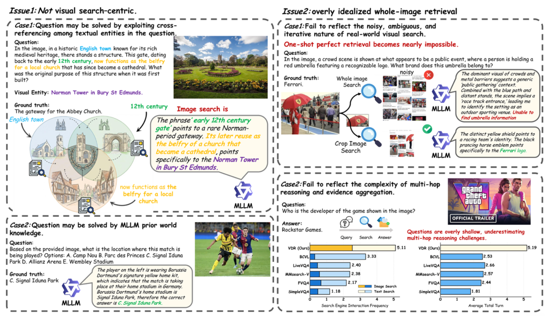 不够「视觉搜索中心」:答案常被问题文本线索泄露,甚至可用模型先验知识 / 纯文本检索绕过视觉验证,导致分数虚高。