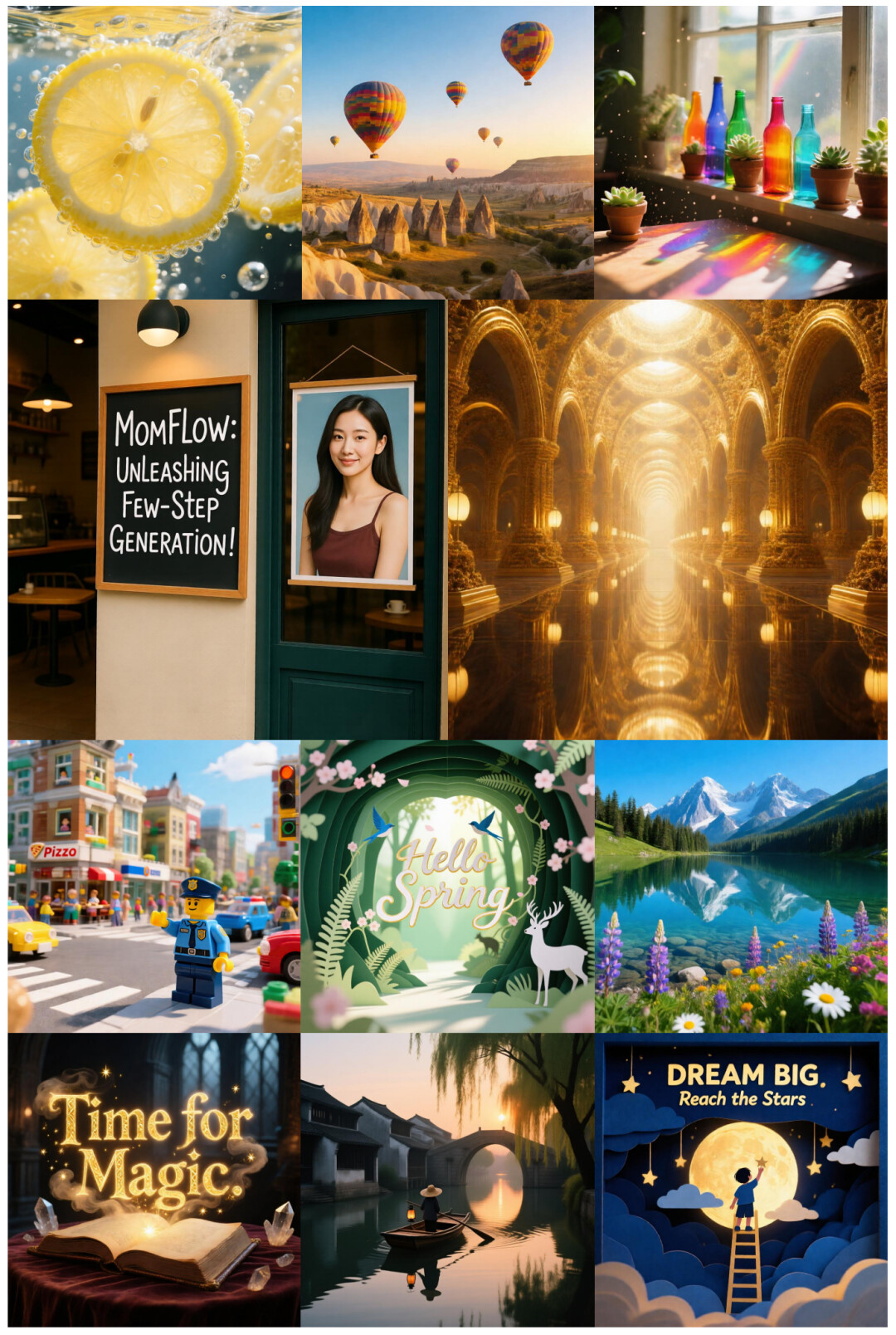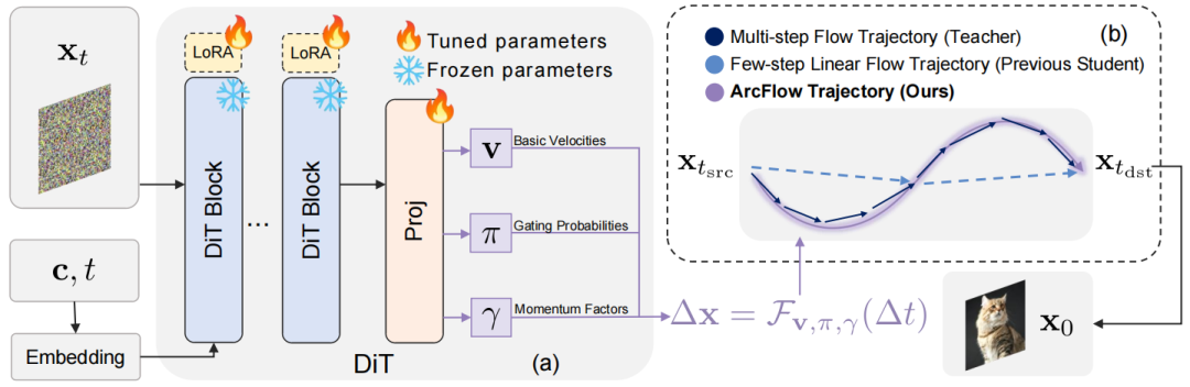 因此,ArcFlow 不需要破坏教师模型原本的参数。实验证明,仅需通过 LoRA 微调不到 5% 的参数(主要是为了适应新的动量预测头),就能实现完美的轨迹对齐。