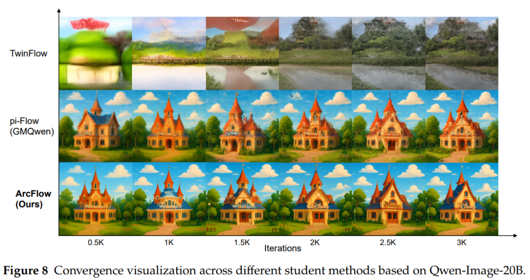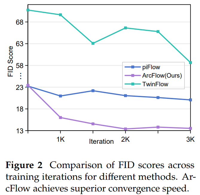 训练收敛极快:相比 TwinFlow 等全量微调方法,ArcFlow 的收敛速度快了超过 4 倍。