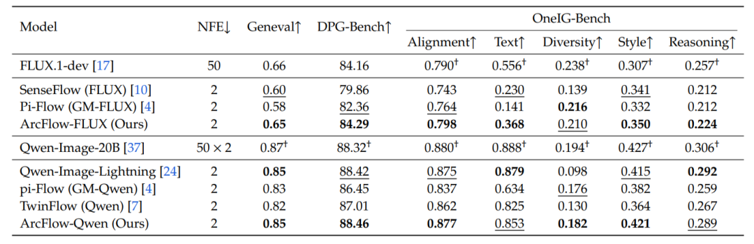 团队在 Qwen-Image-20B 和 FLUX.1-dev 这两个目前最强的开源模型上进行了验证。结果表明,ArcFlow 在速度、质量和效率上实现了的平衡。