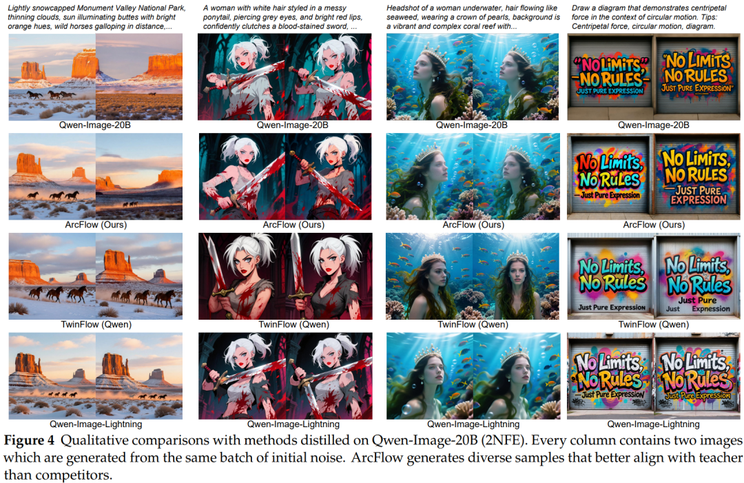 这一设计让 ArcFlow 能够显式地构建非线性轨迹。在 2-4 步的极少步数下,这种非线性轨迹比生硬的直线能更精确地贴合教师模型的原始路径。