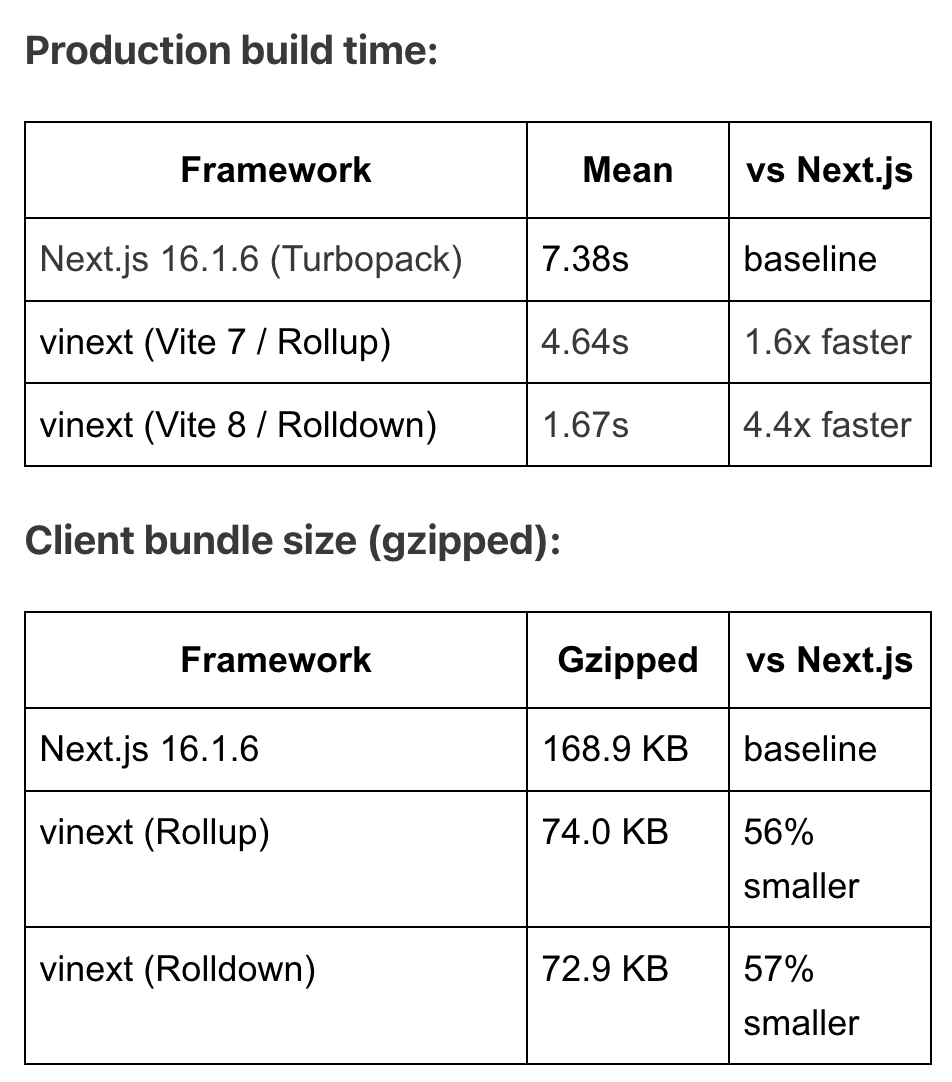 在某 33 路由应用上,利用 Vite 8(Rolldown)构建,vinext 构建时间比 Next.js 快约 4.4 倍;