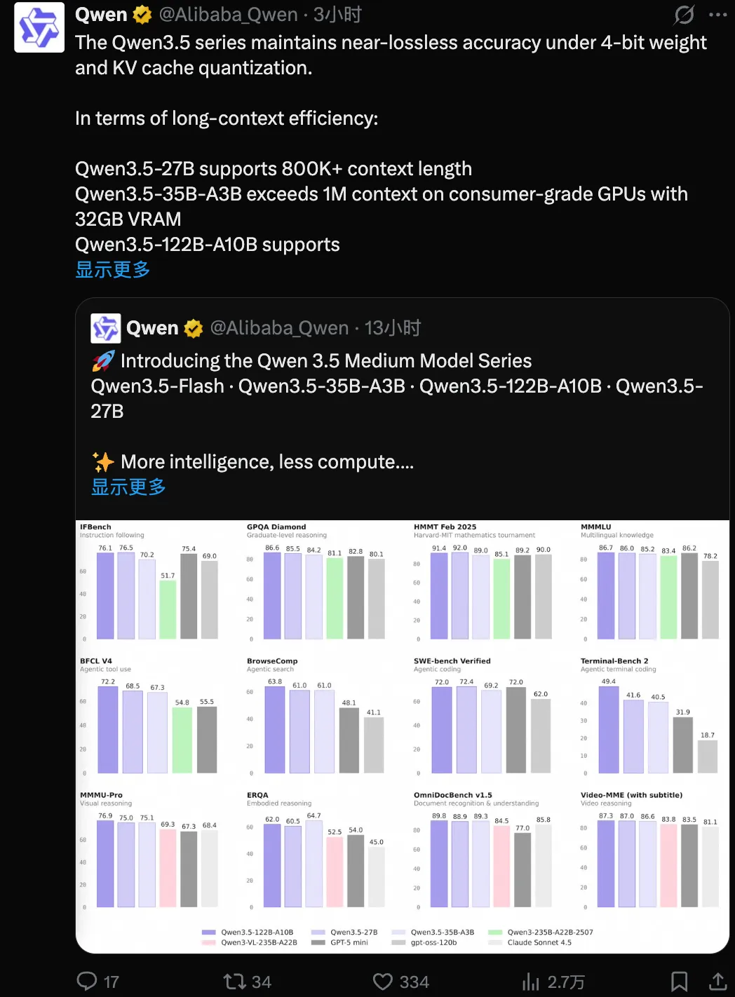 2 月 25 日,继除夕开源 Qwen3.5-397B-A17B 之后,阿里继续开源千问 3.5 系列模型,而且是一口气开源三款中等规模的新模型,分别是 Qwen3.5-35B-A3B、Qwen3.5-122B-A10B、Qwen3.5-27B。
