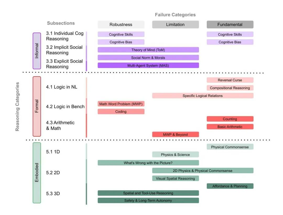 通过这一分类可以看到,不同领域中的失败现象并非彼此孤立。许多根本性问题会跨越推理类型反复出现,而鲁棒性问题则揭示出模型内部推理结构的不稳定性。