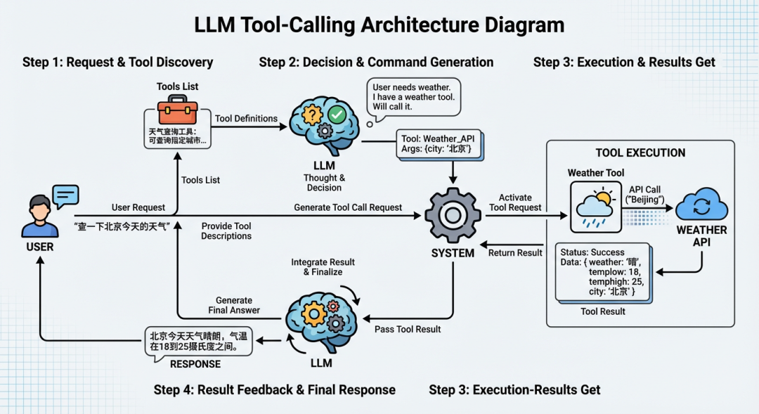 // 1. 从LLM响应中提取工具调用信息 const toolCall = response.choices[0].message.tool_calls[0]; const functionName = toolCall.function.name; // "get_weather" const functionArgs = JSON.parse(toolCall.function.arguments); // {city: "北京", date: "today"}// 2. 根据工具名称找到对应的函数