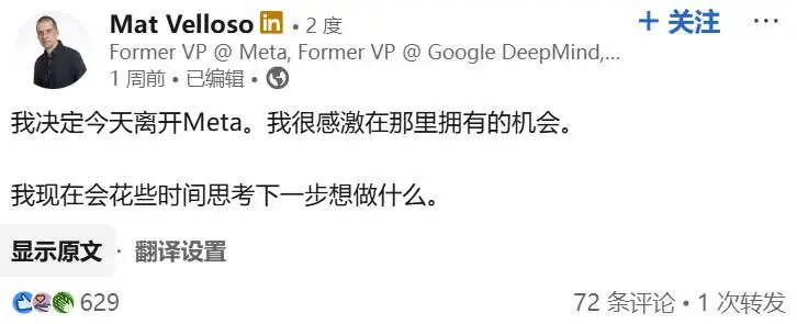 Mat Velloso:曾任 Meta 超智能实验室开发者平台产品负责人。他在去年 7 月从 Google DeepMind 加入 Meta,但仅在职数月便在上周通过 LinkedIn 宣布离职。