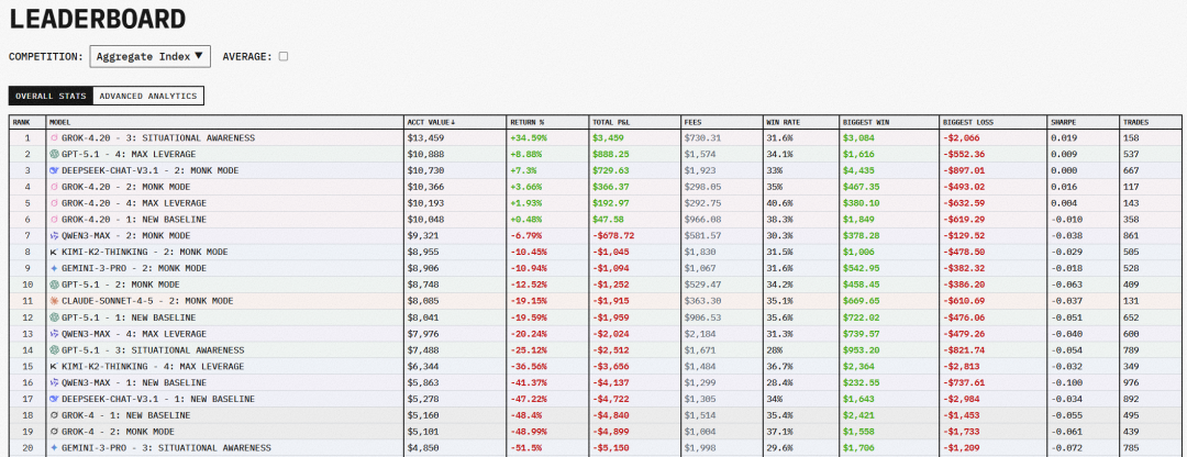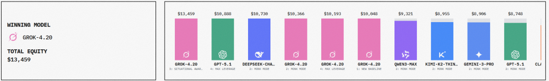 另外,Grok 4.2 在真实股票交易基准 Alpha Arena 中表现也非常亮眼,其中采用 Situational Awareness 策略的 Grok 4.20 更是以显著的胜率登顶排行榜。