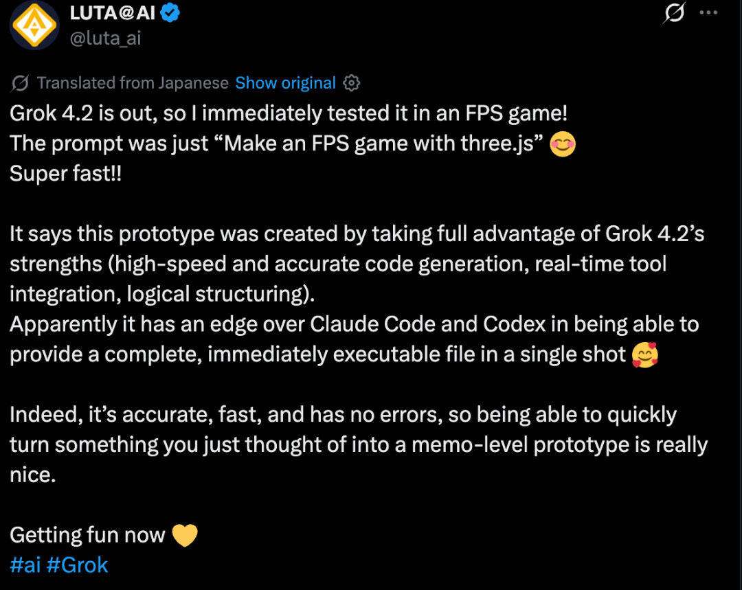 还有网友直接让它用 three.js 制作一个 FPS 游戏,这个原型充分发挥了 Grok 4.2 高速精准的代码生成、实时工具集成、清晰的逻辑结构的优势。