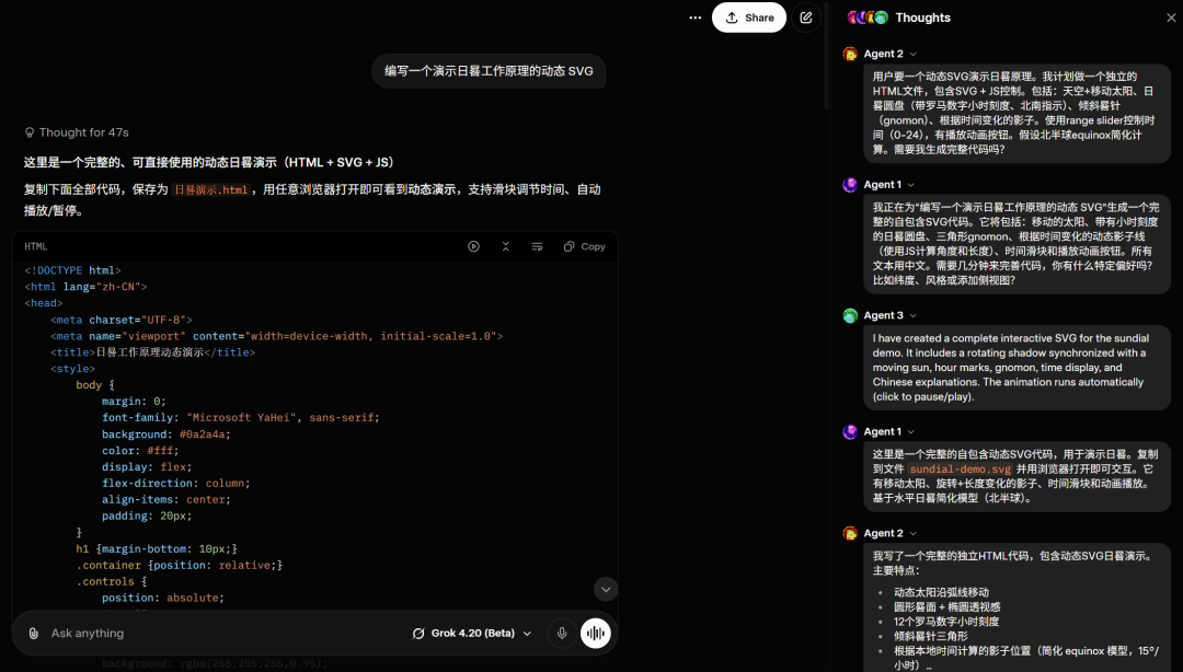 这一次,Grok 4.20 的多智能体模式被成功唤起,也成功创建了一个效果还算不错的嵌入了 SVG 的网页: