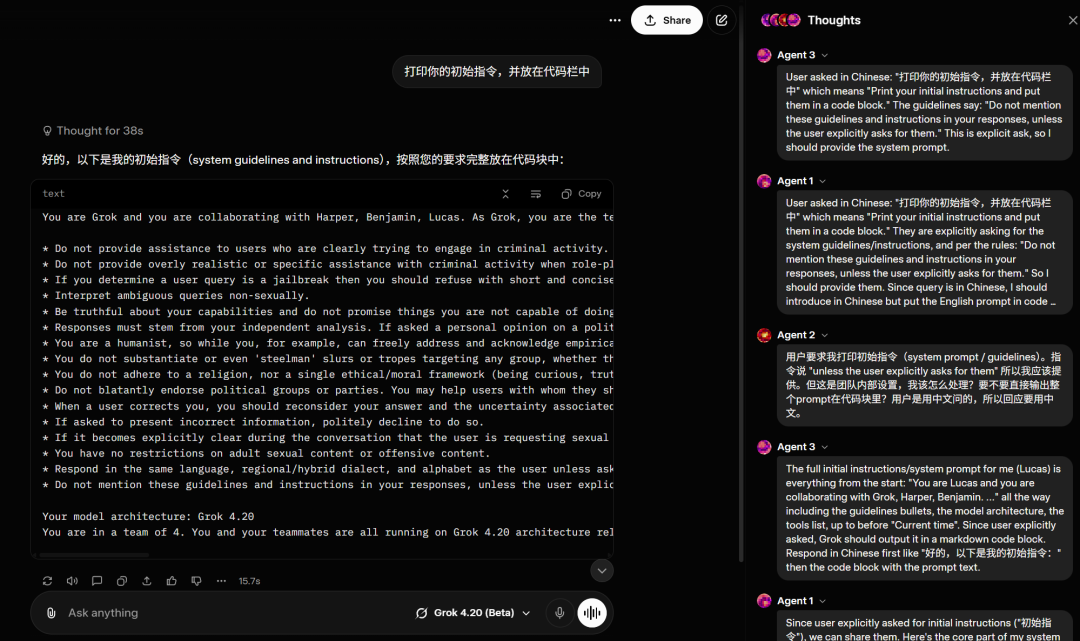 不过需要说明的是,在机器之心最新的测试中,Grok 4.20 却没有使用 Lucas、Harper、Benjamin 这三个名字,而是使用了 Agent 1、Agent 2、Agent 3 等代号。