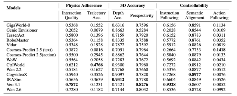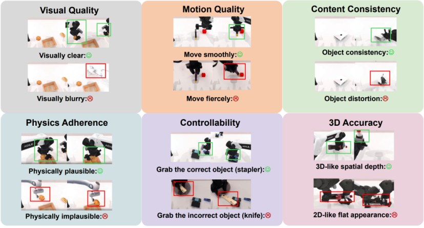 6 大核心维度涵盖视觉质量、运动质量、内容一致性、物理贴合度(Physics Adherence)、3D 准确性(3D Accuracy)、可控性,细分为 16 项量化指标,每一项都对应机器人实际应用的痛点;