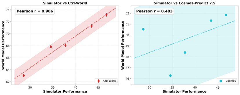 Ctrl-World 的 Pearson r=0.986,近乎完美复刻真实环境评估结果,远高于英伟达 Cosmos-Predict 2.5 的 0.483,印证了其作为虚拟仿真环境的可靠性。