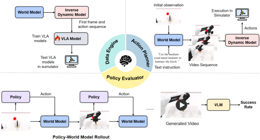 3 大具身任务(数据引擎、策略评估、动作规划)模拟模型的真实使用场景,直接考核「生成的内容能不能训练机器人」、「模拟的环境能不能测试策略」、「规划的动作能不能完成任务」;