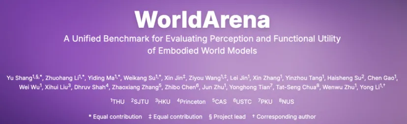 WorldArena 由清华大学牵头,联合普林斯顿大学、新加坡国立大学、北京大学、香港大学、中科院、上海交通大学、中国科学技术大学等 8 所全球顶尖学术机构共同研发,团队成员均为具身智能、计算机视觉、机器人学领域的权威学者,共同制定了兼具科学性与实用性的硬核评测标准。