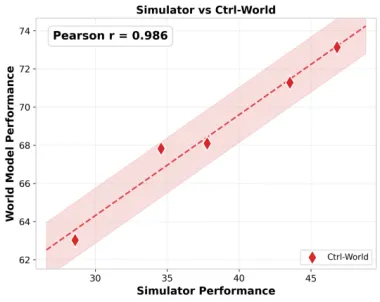 在最具实用价值的策略评估(Policy Evaluator)任务中,Ctrl-World 与真实物理模拟器(RoboTwin 2.0)的评估结果相关性高达 0.986,近乎完美复刻真实环境动态。这意味着开发者可直接用 Ctrl-World 测试机器人策略,无需搭建昂贵的真实物理环境,大幅降低研发成本。