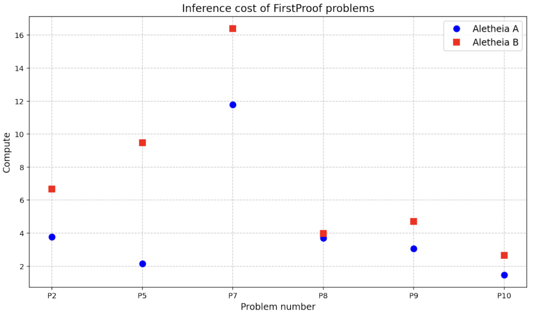 Aletheia A 与 Aletheia B 针对相同的六道题目都生成了候选解答。单独来看,每个智能体都至少出现过一次「假阳性」(false positive),但在 best-of-2 的评估机制下,它们共同为六道题目都提供了可信的解答。这一结果相比 2025 年 12 月用于解决 Erdős 问题的 Aletheia 版本,在准确率上有明显提升。