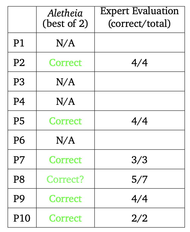 Aletheia 在 FirstProof 上的性能总结。专家评估列显示了在咨询的总专家人数中,有多少专家将解决方案评为正确。仅在 P8 上的评估不是一致的。