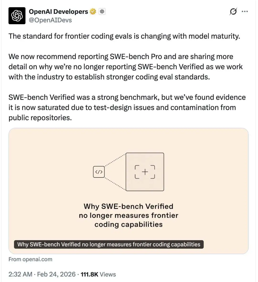 今天,OpenAI 正式宣布 SWE-bench Verified“退役”。几小时前,OpenAI 的开发者账号发推明确表示:SWE-bench Verified 将逐步退出舞台,已不再适合作为前沿编程模型的主要对标基准;官方更建议大家转向 SWE-bench Pro。
