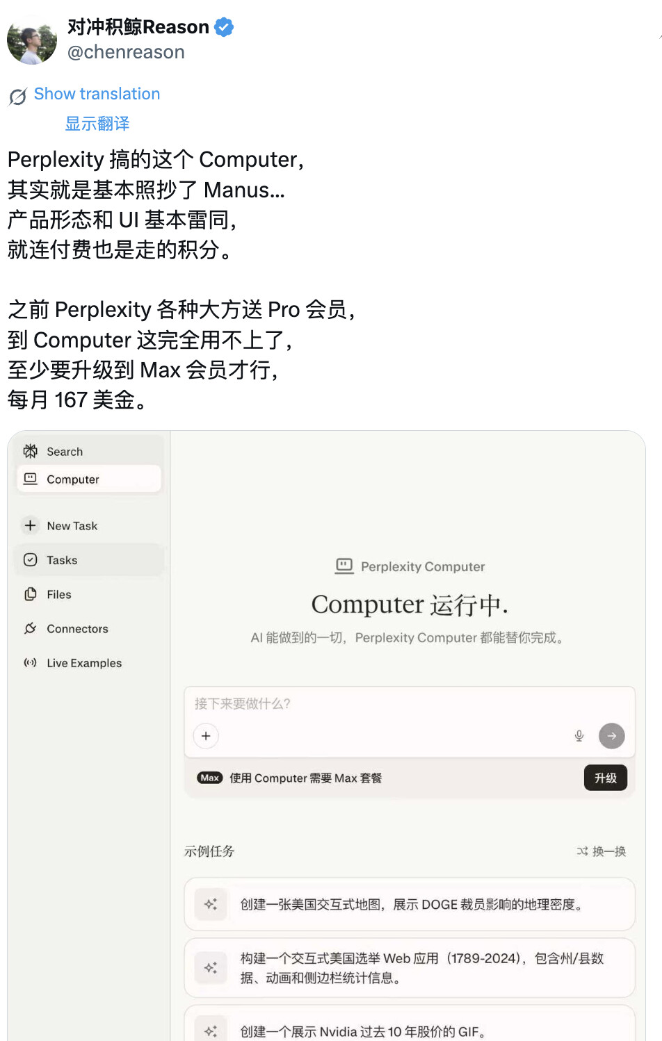 现在 Perplexity Computer 横空出世,即没有既抢注桌面控制,也不只做企业协作。网友放图锐评: