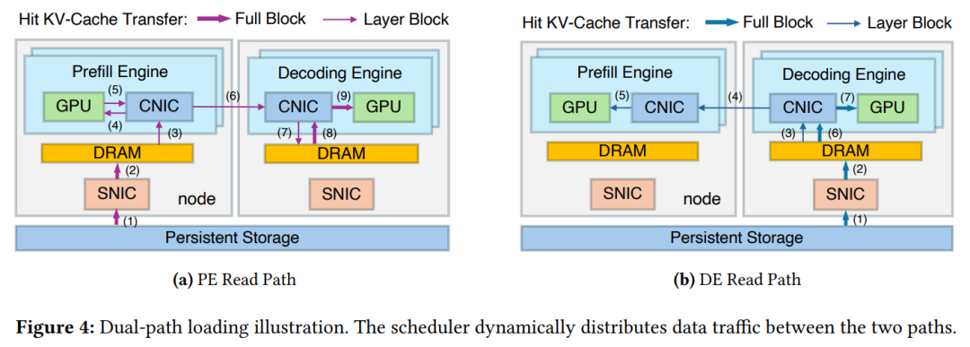请求调度器(Request Scheduler)。一个中心化调度器,负责接收客户端请求并将其分配到不同引擎。同时,它还负责在两条加载路径之间动态分配数据流量(如图 4 所示)。