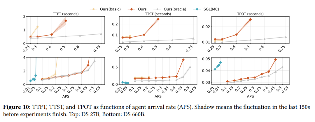 在线服务实验部分则模拟真实生产环境下 agent 按泊松分布持续到达的场景,设置 TTFT ≤ 4 秒、TPOT ≤ 50 毫秒为服务等级目标。结果表明,DualPath 显著提高系统可承载的到达率上限:在 DS 27B 上提升 1.67 倍,在 DS 660B 上提升 2.25 倍。