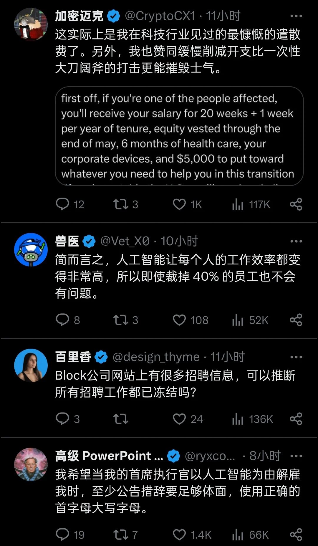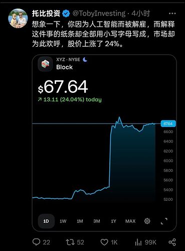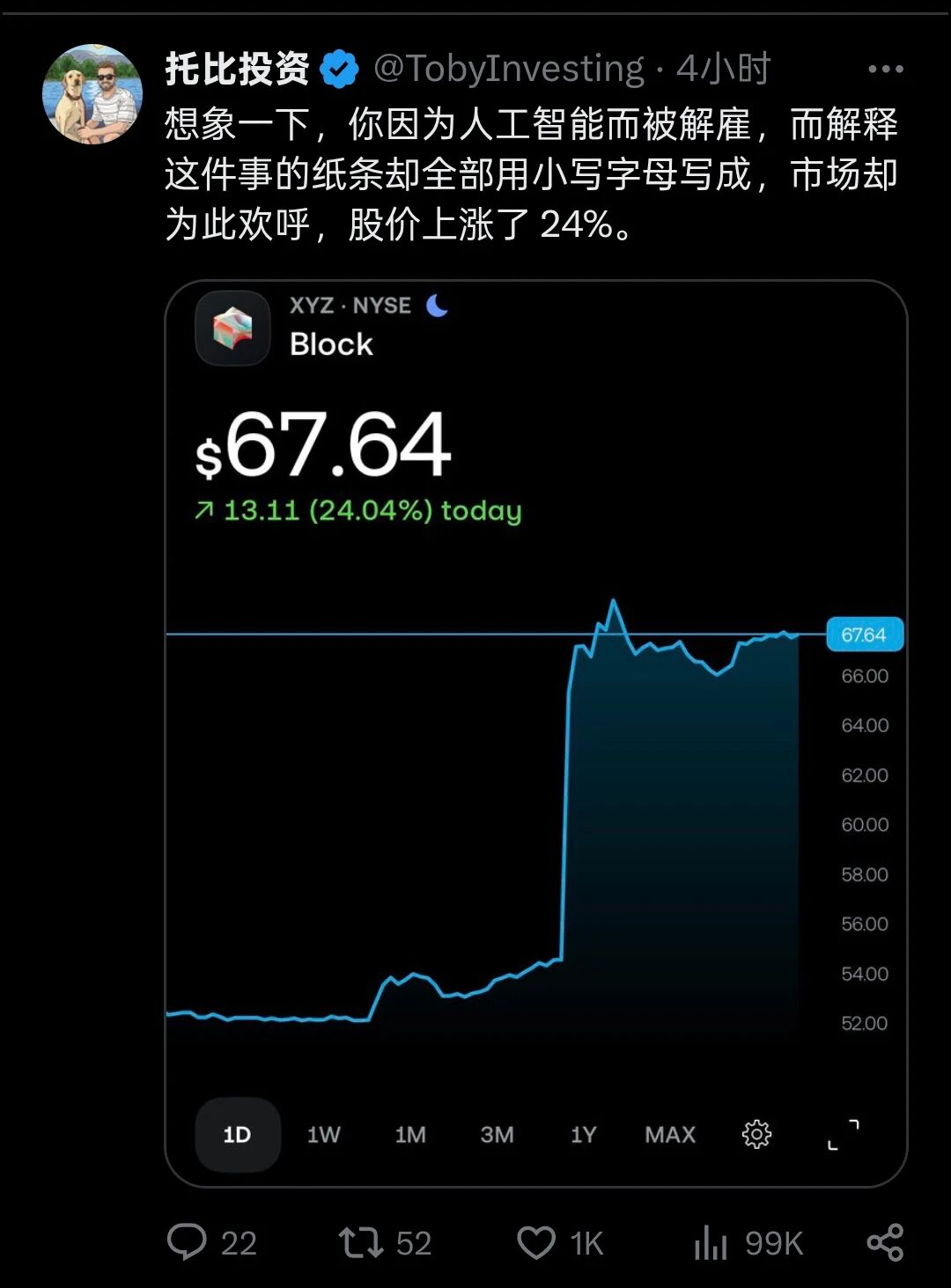 Block宣布裁员近半,豪赌AI自动化。CEO Dorsey预言一年内大多数公司都会跟进。投资者反应积极,股价大涨。