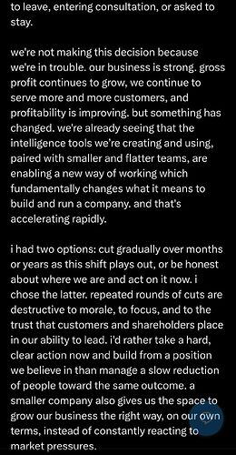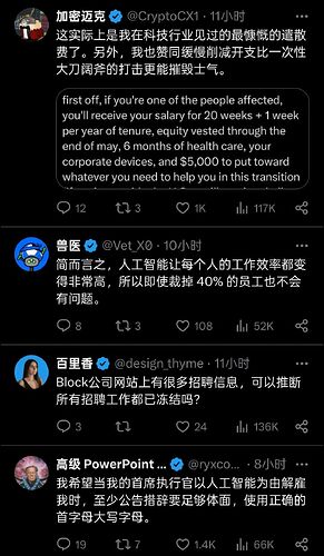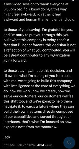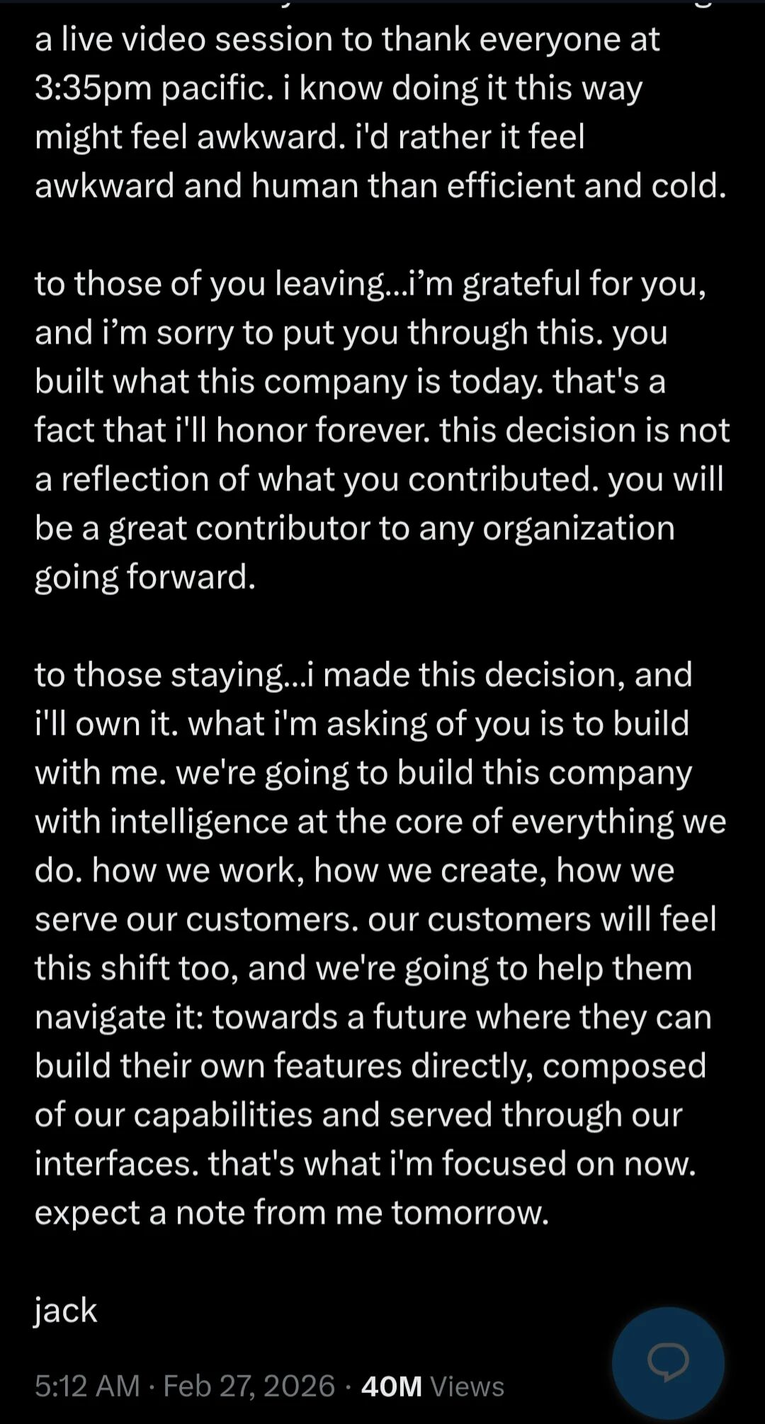 至少在官方说法中,此次裁员是由AI驱动的。Block首席财务官 Amrita Ahuja 表示,裁员将让公司“用更精干、高水准的团队,借助AI自动化更多工作,从而提速发展”。Dorsey则将这次裁员描述为一次主动、甚至体恤员工的选择,而非财务危机。他在X上写道:“一轮又一轮的裁员会摧毁士气、分散注意力,也会辜负客户和股东对我们领导力的信任。”