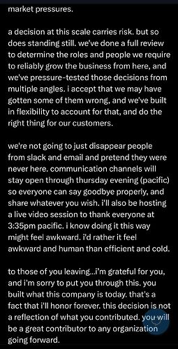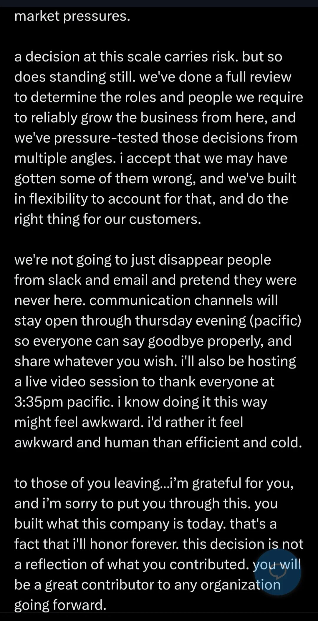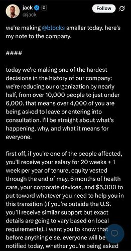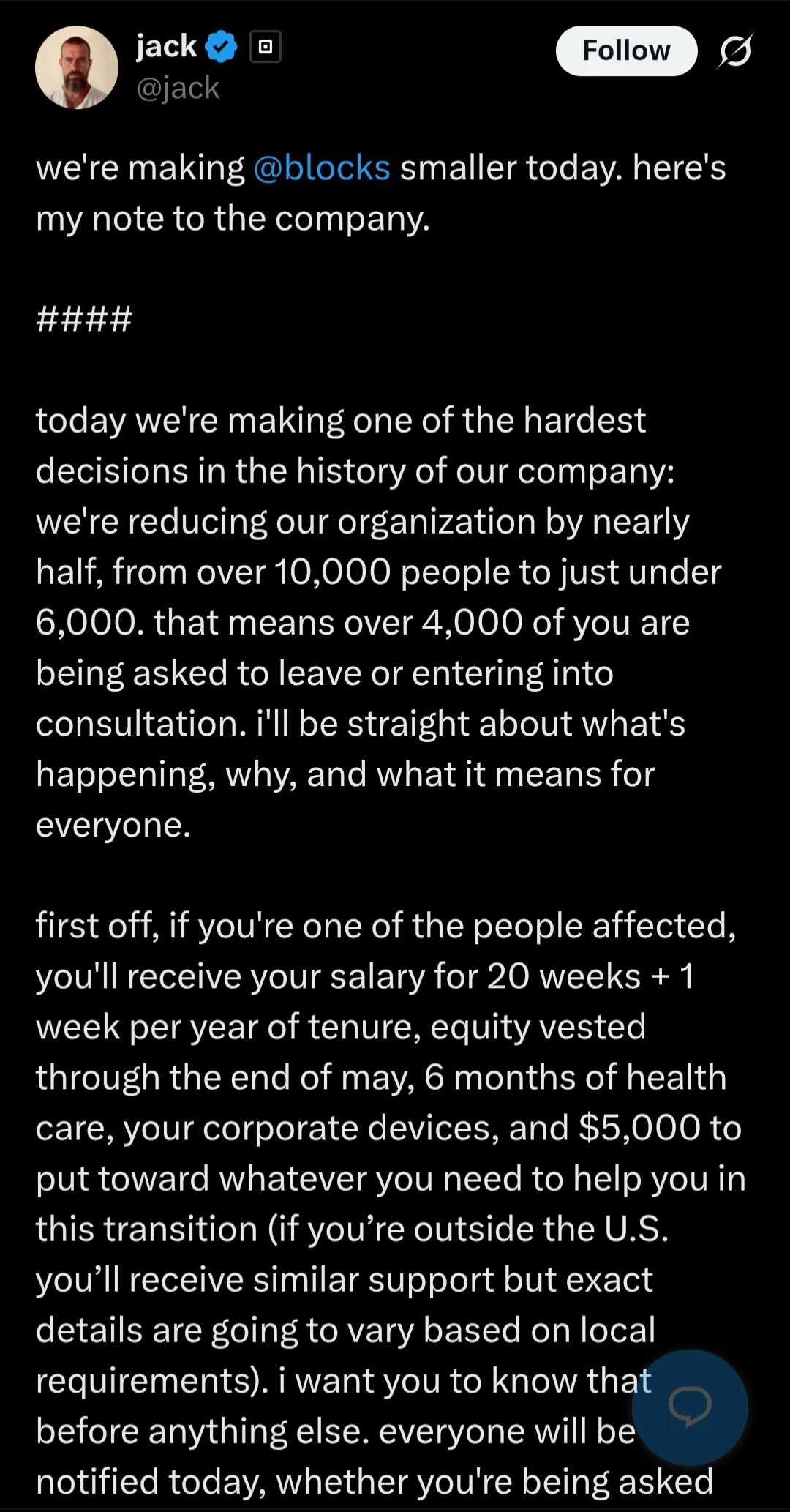 关于遣散费,Dorsey告知美国被裁员工:将获得20周薪资+每工作1年额外1周薪资、5月底前归属的股权、6个月医保、公司设备,以及5000美元过渡补贴。他补充说,美国以外员工将根据所在国政策获得“类似支持”。