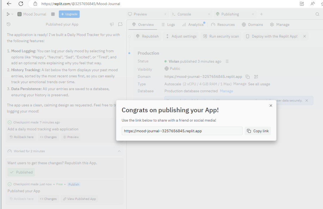 确认计划后,AI 会自动生成代码、配置数据库、部署服务。几分钟后,你就能看到一个可运行的网页应用,点击“Publish now”。