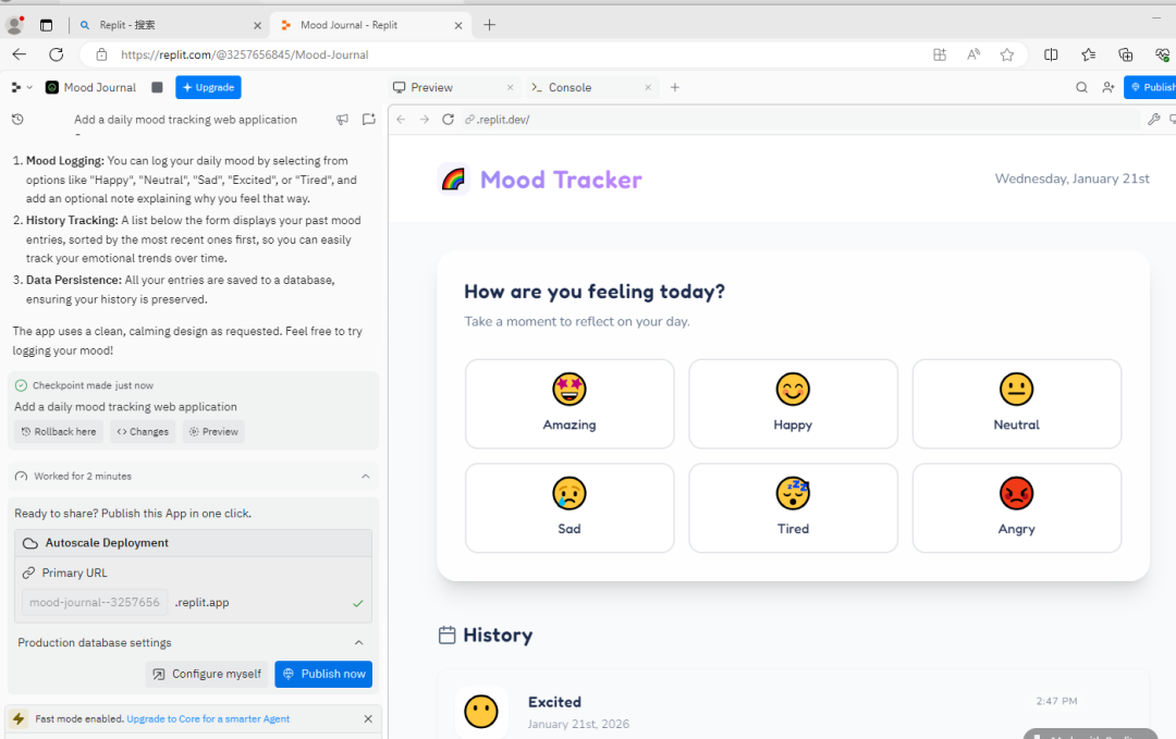 例如输入:“帮我做一个可以记录每日心情的网页应用,要有提交按钮和心情历史列表。”