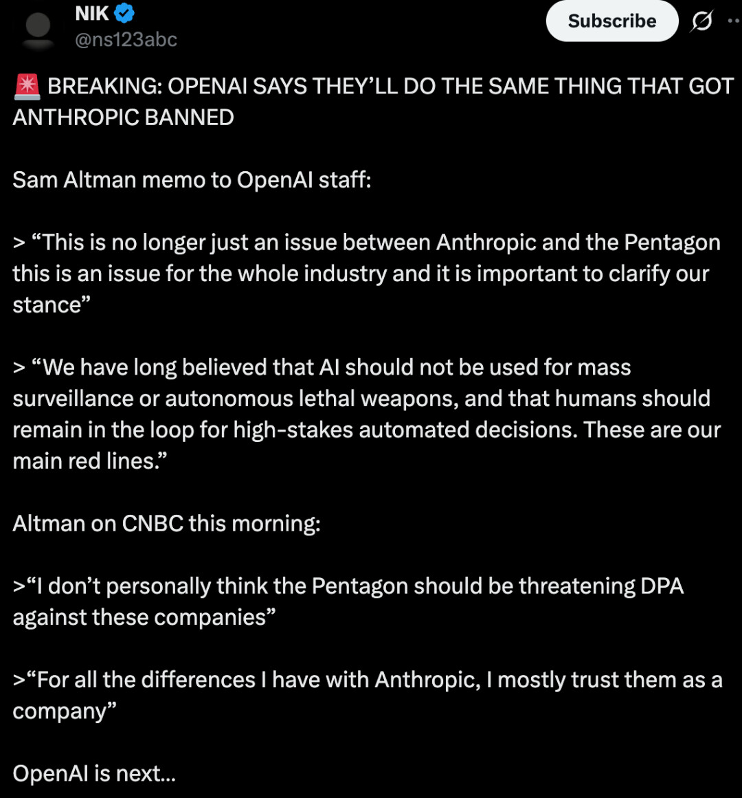 奥特曼今天早上在 CNBC 节目中说道:「我个人认为五角大楼不应该以《国防生产法》威胁这些公司。尽管我和 Anthropic 公司有很多分歧,但我总体上还是信任他们这家公司,而且我认为他们确实很重视安全。」