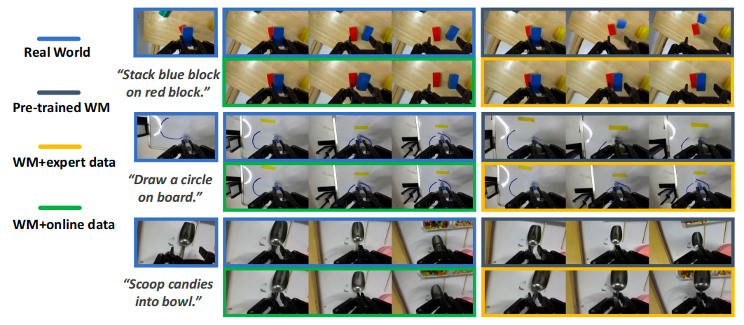 比如舀花生入碗、用纸巾擦白板标记这类需要精准物理交互的任务,预训练的世界模型完全抓不住细节,仅用专家数据微调的模型则过于乐观,而经 VLAW 校准的世界模型,能精准捕捉底层的物理动力学,生成的结果和真实世界高度吻合。