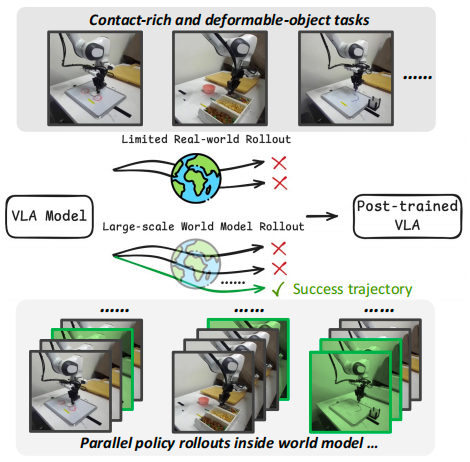 VLA 策略在线 rollout 数据有助于将预训练的世界模型适配到下游任务中。一旦世界模型完成适配,就能为 VLA 策略学习生成海量数据