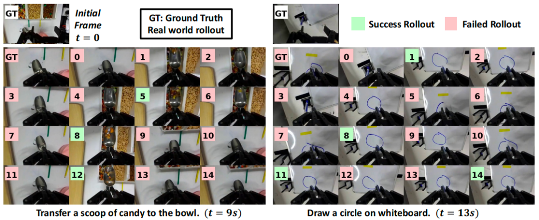 GT 代表真实世界的 rollout,0~14 代表世界模型生成的多种想象轨迹,所有轨迹均从相同的 GT 初始帧出发并使用 π0.5 策略。在真实世界 rollout 中,机器人未能抓住勺子(左,GT)且未能画出完整的圆(右,GT)。借助世界模型,我们能为这些失败案例找到成功的轨迹,这对策略学习具有重要意义