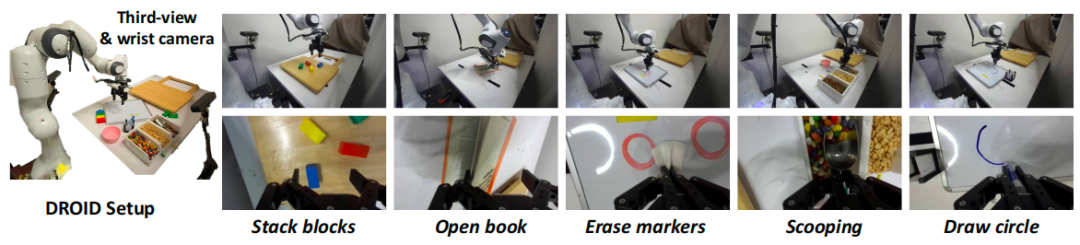 实验在 DROID 平台上开展,涵盖五类任务,如图所示。这些任务涉及复杂的物理交互,包括频繁的接触和可变形物体,难以在传统仿真中建模。