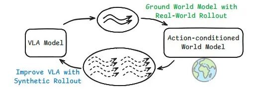 VLA 策略采集的真实交互数据,反过来用于提升世界模型的物理保真度;
