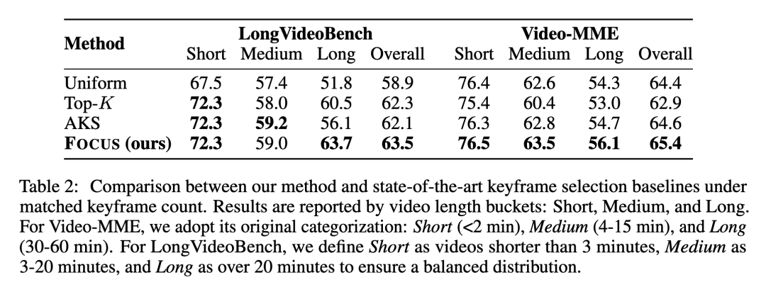 结果表明:在长视频场景(例如 >20 分钟 的设定)下,FOCUS 相比均匀抽帧带来最高 11.9% 的性能提升。同时,FOCUS 在不依赖降采样等预过滤手段的情况下,平均仅需观察 <2% 的帧即可达到上述收益,显著降低了关键帧选择与推理阶段的总体计算开销。