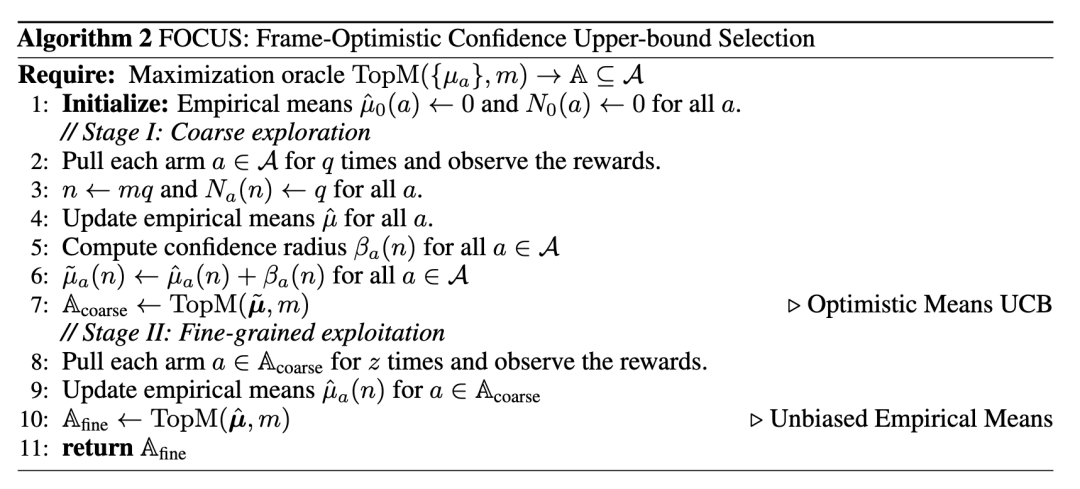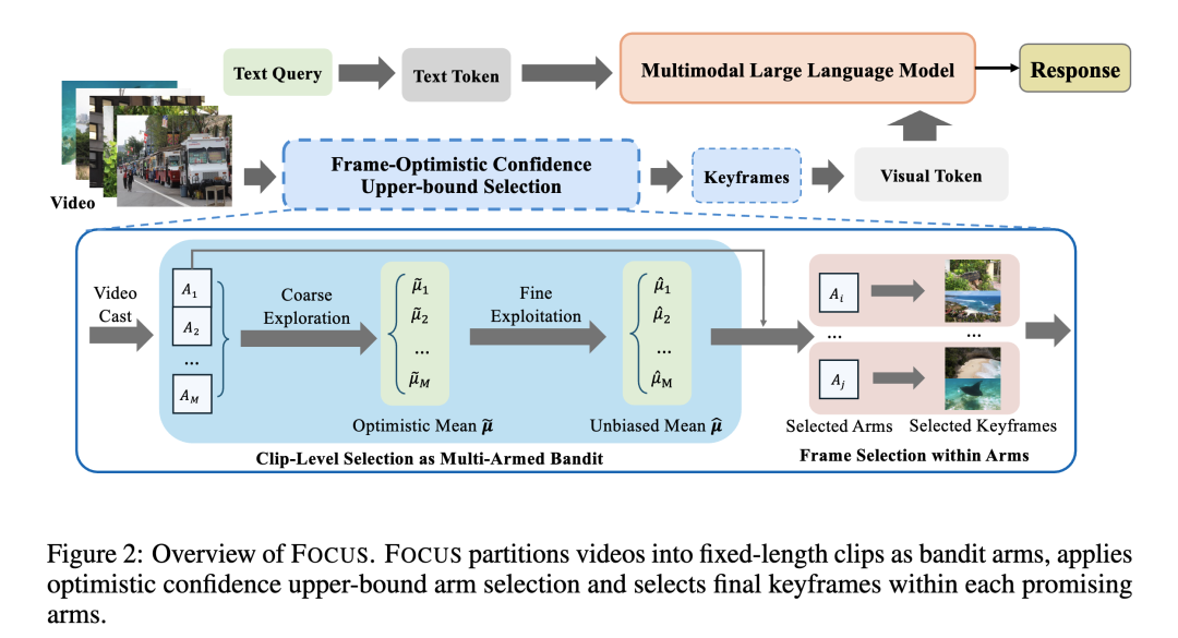 具体而言,FOCUS 将关键帧选择建模为组合纯探索(CPE)的多臂赌博机问题,并采用两阶段的 coarse-to-fine 策略: