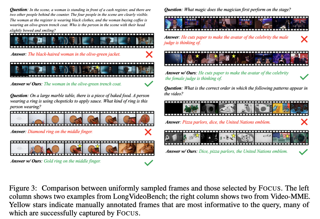 作者对若干典型样例进行可视化分析:在长视频中,FOCUS 通过两阶段探索快速将注意力收敛到少量高价值片段,再在片段内部挑出证据帧,使得输入给 MLLM 的帧更 “信息密集”,从而提升回答质量。