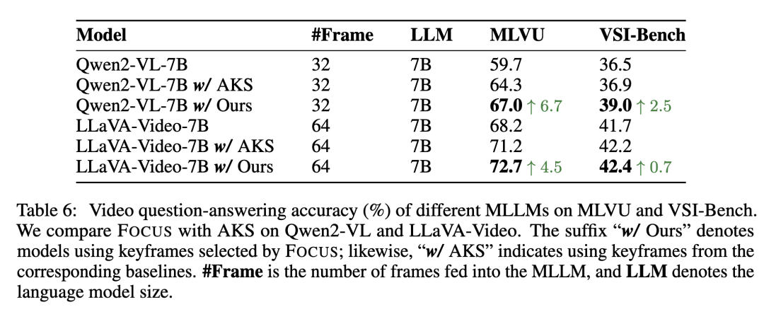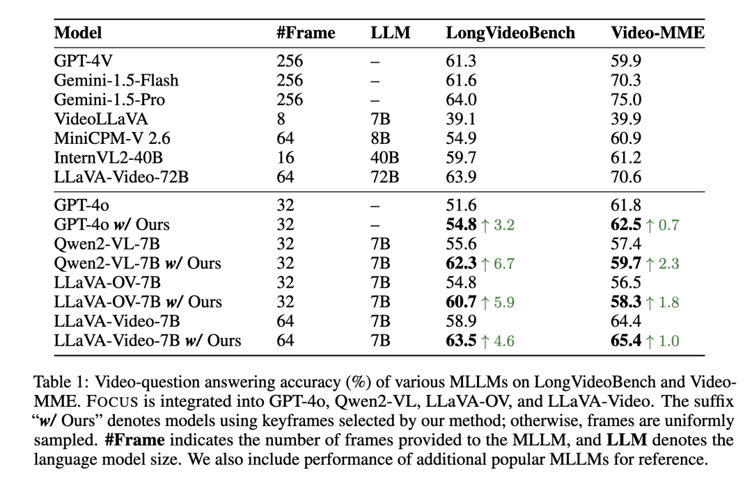 为了验证 FOCUS 的通用性与有效性,作者在四个公开视频问答(Video QA)基准上进行了评测,并选择了四种常用的 MLLM 作为下游推理模型,包括 GPT-4o、Qwen2-VL、LLaVA-OV、LLaVA-Video 等。